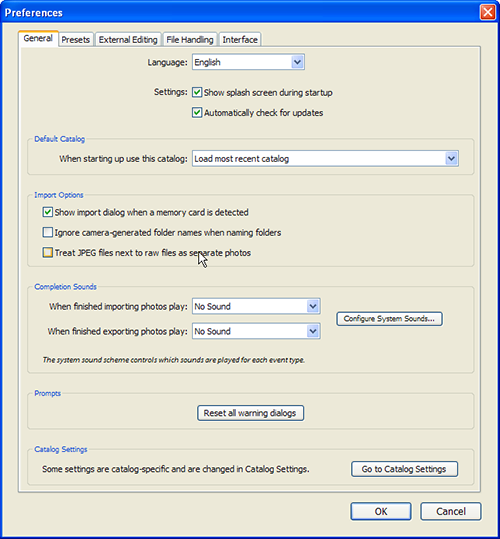 First of all it's worth having a quick look at the Preferences box (go to Edit > Preferences). Personally, I dislike automatic import boxes popping up when a memory card or camera is detected. The Preferences options will also be increasingly important the more you get to use and understand Lightroom as well.