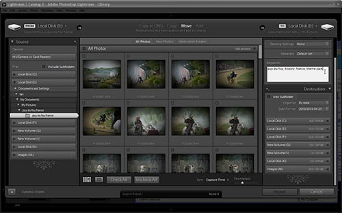 The import screen lets you tag all the images you are importing with appropriate key words so that they can be found easily in the future. You can enter them via a box at the top right of the import panel. At this stage you are tagging all the images you're importing with the same set of key words, but you can later tag individual images or different selections of images with additional key words. You can also apply the key words set to one image to any other images via a process called metadata synchronisation. This process can actually do a lot more, including apply copyright, identification and many other parameters that you can set. We'll covering this later.