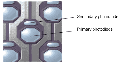 An explanation of Super CCD SR Super CCD SR uses a new CCD arrangement, based on the advanced octagonal sensor arrangement that Fujifilm pioneered with 3G Super CCD, but taking the concept even further with a ‘double honeycomb’ shaped photodiode structure. Not one, but two photodiodes capture information on the same area of the image. The sensitive primary photodiode registers the main volume of light reflected off the subject (similar to a conventional Super CCD photodiode), whilst the secondary photodiode captures highlight information from the same part of the image. Because it is set at a lower sensitivity than the primary photodiode (in other words, records a darker image), the secondary photodiode is able to ‘see’ additional detail in bright areas that is beyond the reach of conventional photodiodes. Schematic of Super CCD SR (double honeycomb structure) sensor layout: