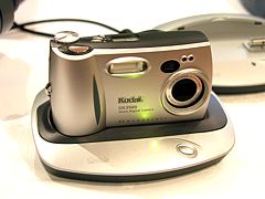 Kodak’s EasyShare philosophy is based around a USB-connected docking station that serves as a PC data link and a battery charger for the camera. By pressing the sole button on the docking station, all pictures inside the camera are moved to the PC.