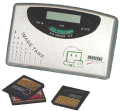 An ImageTank is a compact battery powered portable hard drive complete with a pair of memory card slots accommodating both Compact Flash and SmartMedia users. In theory, if you currently use a laptop, you could leave it at home and use a less bulky ImageTank instead. All you do is insert your card, press a button and a copy of the entire contents of the card is made. It doesn’t delete the originals - leaving that choice up to you. Later, you connect the ImageTank to your PC via USB connection and it becomes an external drive to that computer. You can copy or rename files on ImageTank as you see fit. 10GB and 20GB ImageTank models are available. The ImageTank has been tested with SmartMedia cards up to 128Mb and is Type II CF memory card compatible as well as IMB Microdrive compatible. A Lithium ion rechargeable battery is included, as are a mains adapter and a cigarette lighter adapter. Prices are: 10GB model - £399 inc.VAT, 10GB model - £499 inc.VAT. Crown Photo Systems Web site: www.crownphoto.co.uk | ||||
