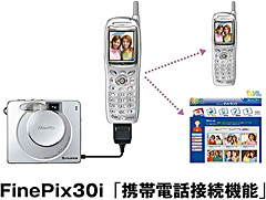 To be more exact the Japanese version of 30i will connect to a cdmaOne multimedia phone. You can display your snaps on the phone itself or transmit them to the Web (see right).