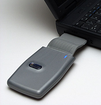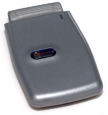 on the side of your notebook PC Not strictly speaking a digital photography peripheral, the Mountain Solutions ABSplus will still be of interest if you use your laptop to store your images. ABS stands for Automatic Backup System, a hard drive back up software solution bundled with a selection of external back up hard drives, including the ABSplus. The ABS plus is a plastic cased one third height 2.5 inch hard drive that connects to a laptop PC via a PCMCIA slot. We looked at a 6GB model and options range up to 48GB. Instead of yet another cable to get tangled or lost, the ABSplus unit has an integrated PCMCIA connector. It’s a ruggedised flat ribbon cable with a PCMCIA Type I fit connector. It folds flush when not in use.