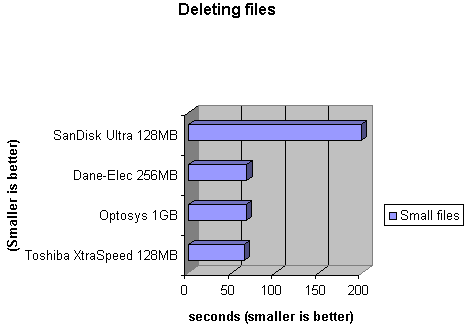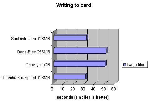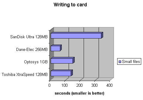 In fact, the Toshiba XtraSpeed is easily the best all-round CF card performer we have tested to date. Large file read rates are comparable to SanDisk’s Ultra card, but without any of the Ultra’s problems keeping when the card is read or when dealing with small files. Test resultsHere are the graphed results of our timings of the Toshiba XtraSpeed card, including comparisons with other cards we have tested recently: