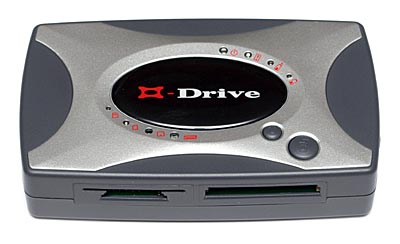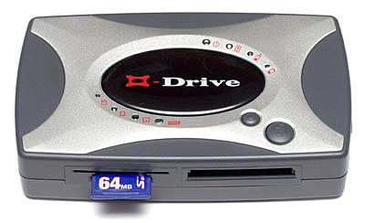 both Type I and II cards and IBM Microdrives. ConclusionIf speed is not a major concern, we can happily recommend the X’s-drive as a value for money, self-powered, versatile, card reader and external USB hard drive. Prices start at £99 + VAT if you want to fit your own hard drive, or £239 inc.VAT with a 20GB hard drive fitted. Power supply/charger and carry case are included. Buy your X’s-drive from Paperandinks Important note: early examples of the X’s-drive had a bug that could potentially corrupt image files copied from ‘fragmented’ memory cards. By ‘fragmented’, we mean disk file fragmentation. This is caused when a storage device, like a hard disk or a memory card, has files spread across the disk space in more than one chunk per file. This usually happens when there is no more space for a file to be stored in one chunk, so the filing system breaks it up and stores it in two or more chunks. Deleting some images on a memory disk and saving new ones without deleting all the old ones beforehand, or reformatting the card, gives rise to fragmentation. This is perfectly normal, but older X’s drives can corrupt files as a result. During our time testing the X’s-drive, which was an early unit, we did not notice any file corruption. But the danger is there. Luckily, there is a fix and if you think your drive may be at risk, contact your supplier for advice. You should be offered the choice of returning the drive for the fix to be applied, or, if both parties are willing, you can obtain the software fix to do it yourself. However, one further complication is that Windows 98 is required for the operation. This issue raises an interesting point with regard to testing of random access storage devices and we will be changing our test procedure to check for this problem in future.