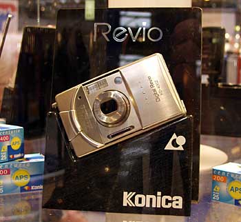 Don’t be fooled by the APS logo and rolls of film; above is the new 4 megapixel Digital Revio KD-400Z announced today both here and in Florida at the PMA show. Supplementing Konica’s existing 3MP own-brand badged version of the Kyocera Finecam S3, the new KD-400Z has a 3x optical Hexanon f/3.4-4 zoom lens, movie clip mode with sound and the unique compatibility combination of being able to take both Sony Memory Stick and SD/MMC memory cards. All this is in a tiny package reminiscent of Canon’s Digital Ixus range. We’re promised a price of under £400 when the KD-400Z ships early in the summer.