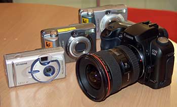 All of Canon’s newly announced models, bar the black G2 kit (click here), were spied at the Canon stand. Above you can see (left front) the £189 1.3MP PowerShot A100 (click here), the PowerShot A30 and A40 (click here) and the new 6MP EOS-D30 SLR (click here).