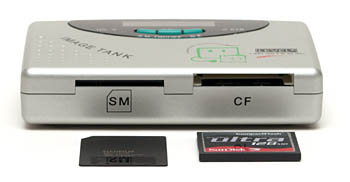 The Image Tank is compatible with SmartMedia and Compact Flash memory cards. It can also be used with other types of card, including Sony Memory Sticks through the use of Compact Flsh adapters, which Card Media can supply. The actual Image Tank on offer has a 20GB hard drive fitted and is supplied with a lithium ion power pack, protective case, plus mains and cigarette lighter power adapters, all worth more than £350 including VAT. For more information on the newsletter and how to register, click here. | |||