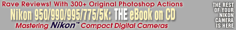 You can now order Peter’s Mastering Nikon Compact Digital Cameras eBook via this site. Not only will you gain a US$6 discount on the shipping cost (making it free within the US) but you will earn a commission that will help fund Digital Photography Now. To reach the DPN order page, just click on one of the banners on this page or at the bottom of the our front page. Peter has already reached version 4 of his renowned eBook which is indispensable for anyone who wants to make the most of their Nikon CoolPix camera, with particular attention paid to the CP950, 990, 995, 775 and the latest 5000 model. The book has already been reviewed extensively and received some very favourable comments. The eBook, which is priced US$49.95 (roughly UK£35) will work on with any computer that supports Adobe PDF readers, including Windows and Mac, plus various Linux and Unix flavours. The eBook contains over 300 pages of information, 900 charts, diagrams and high resolution illustrations, plus over 300 Photoshop plug-ins and other tools. A micro-site all about Peter’s book is accessible by clicking here - but don’t forget that to earn your discount and to help fund DPN, you need to go to the DPN-specific order page via the banners here or on the bottom of the DPN front page. Peter is already working on his next eBook, which deals with the Sony DSC F-707 digicam.