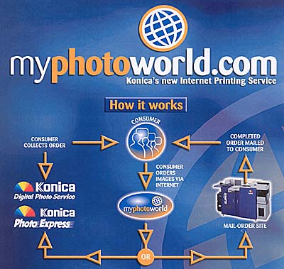 Konica UK has revealed plans for an unusual Internet printing service, myphotoworld.com, that will be open for business next month. It’s unusual because it doesn’t offer any Web-based functionality. Instead, customers must use software provided by Konica to select and prepare their photos for online submission to the printing service. A simplified flow diagram is below: