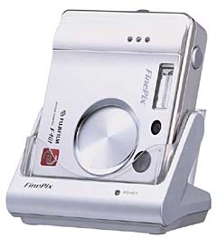 Again, like most of its style contemporaries, the F401 has a 2 megapixel sensor chip, though Fujifilm would point out that this sensor is a third generation SuperCCD type and the camera can be set to output images of 4 megapixels. There has been no sacrifice in the lens department and a 3X optical unit is supplemented by a 3.6X digital zoom. Unlike some of its competitors, the F401 is supplied as standard with a data transfer and recharging docking cradle.