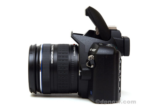 Here is a side profile of the E-400 with the pop-up flash deployed.