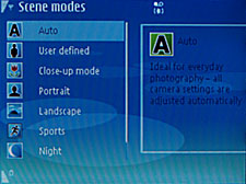 Scenes: auto, night, close-up, snow/beach, cine, old film