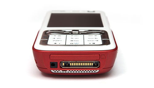 The base of the phone houses the familiar Nokia external connector for headphones or USB connection. The new-style mini power connector is used, but an adapter for compatibility with wider-gauge power connectors is provided. The raised area above the connector is the pull-out cover that conceals a MiniSD memory card slot - more on that later.