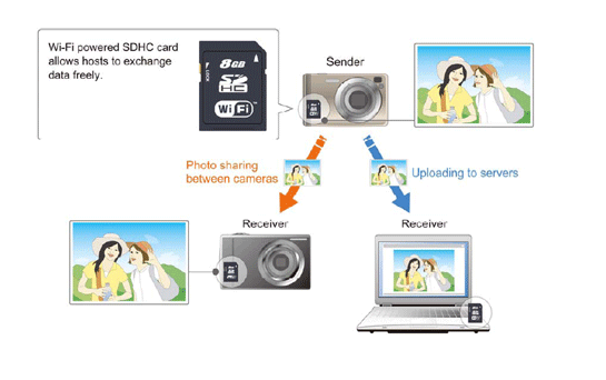 The card is designed to bring Wi-Fi functionality to digital still cameras that have an SDHC slot. Once in a camera, a card can recognize and communicate with the same type of card in another camera (on a one-to-one basis), and users can exchange photographs quickly and easily. It also allows users to upload and download photographs to and from a server without any need for a cable connection or transfers of the memory card.