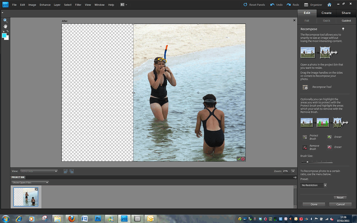 Another example of Content Aware Fill in action in PSE9 is the Recompose tool. Here we are using Recompose with the help of Guided Edits on the right. Recompose lets you select important areas or objects in a picture and then move them relative to each other, with Content Aware Fill adjusting the gaps as seamlessly as it can. In this example the two snorkelling girls are a certain distance apart, laterally. So let's move them closer in order to convert the image from a landscape format to a vertical or portrait format.