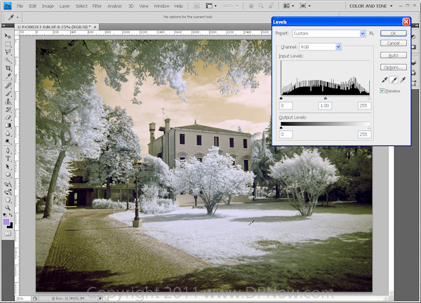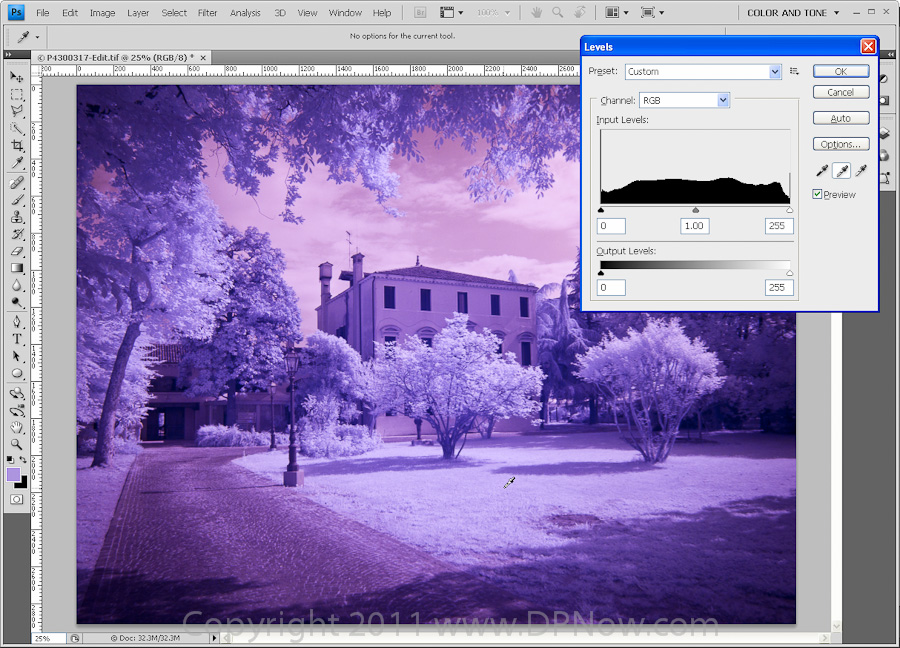 1.Adjust the grey point via the Levels tool. For natural scenes like this, with a lot plants and trees, aim for a sampling area that would be green foliage in the visible light view. Here I'm targetting the grass.
