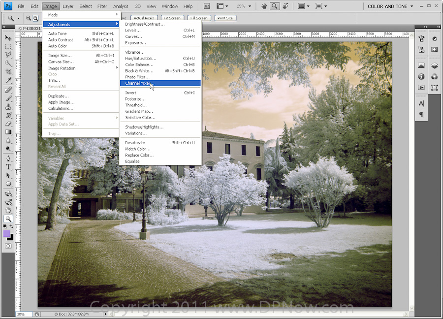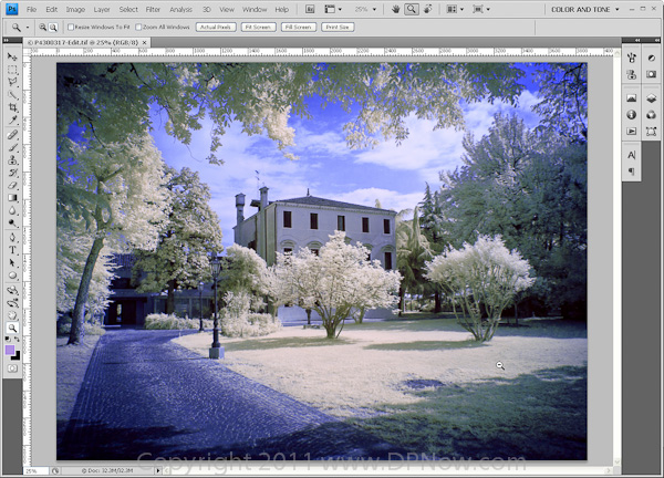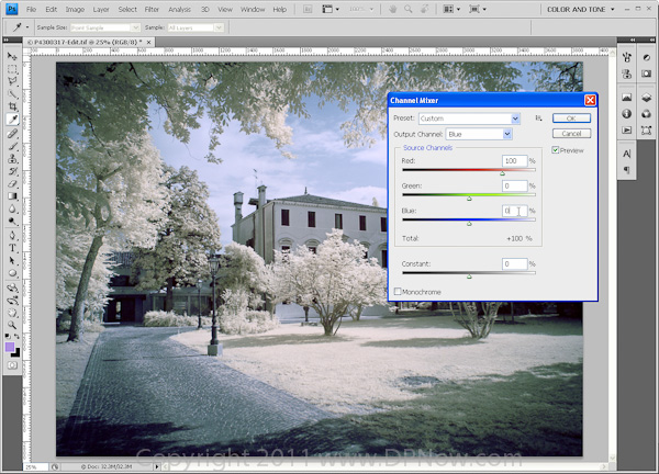 So here is a simple step by step guide to producing false infra red colour by swapping the red and blue channels. Here, we're using Photoshop, but the procedure should be adaptable to other image editors that have an equivalent to Photoshop's channel mixer.
