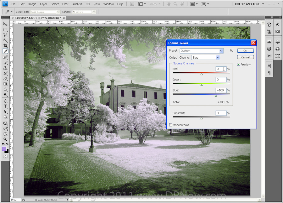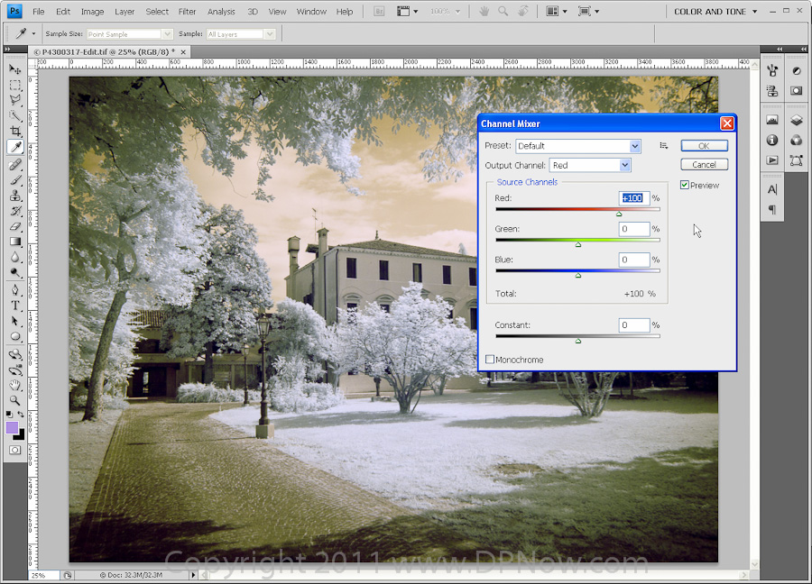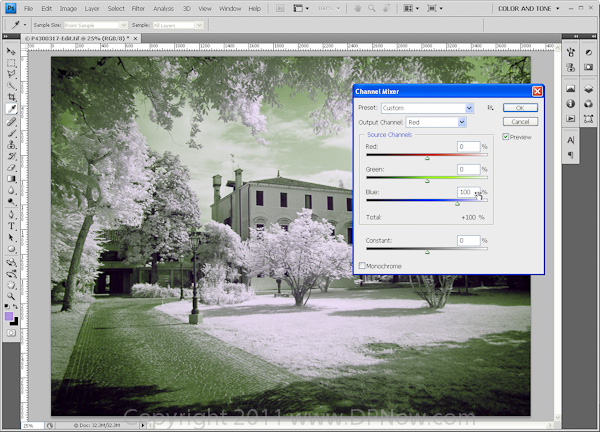 3. The sky is reddish, and to make it a more natural looking blue we need to make the reds blue and, in return, we'll make what was originally red - blue. This requires the use of the channel mixer.