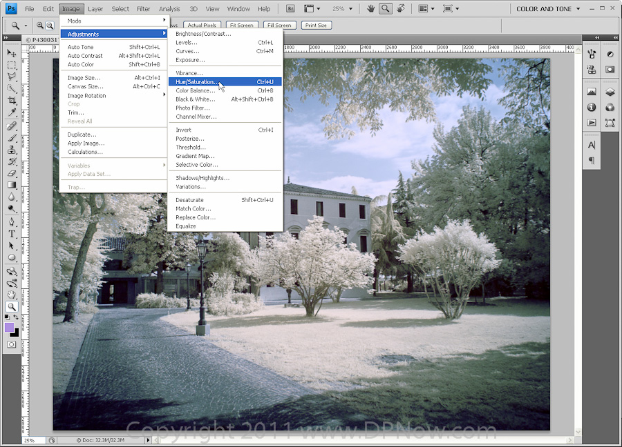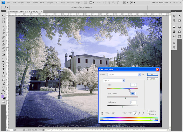 8. Now the sky is blue, sort of. But that can be improved. Often the sky will have too much cyan in it. To fine tune this we can use the Hue and Saturation adjustment tools.