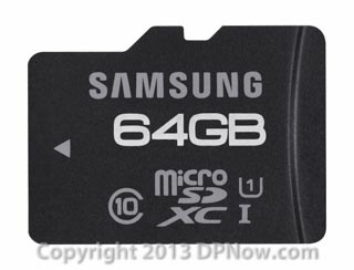 Smartphones made in the last 3-4 years that offer user-expandable memory storage are most likely to support microSD cards. Some conventional digital cameras, notably from Samsung, use microSD cards by default. microSD cards are less than a quarter of the area of a standard SD card and also much thinner. They are very fiddly to use but are actually designed to remain in the host device most of the time. Nevertheless, standard size SD Card adapters are often supplied with microSD cards for compatibility when required. microSD is a physical form factor for SD, SDHC and SDXC card formats. At the time of writing the largest capacity microSD card you can by has a 64GB capacity, costing $50-60.