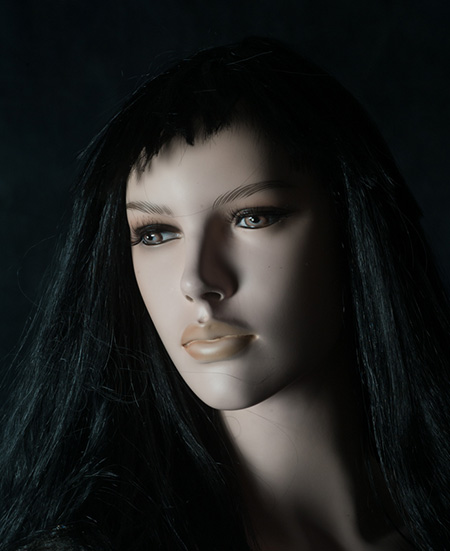 I'd go so far as to suggest that this is an abstract image; it's close to reality but a miss is as good as a mile and you start to spot weirdness in the image. For a start, the eyes are not pointing in a natural symmetry - they are wonky! The skin is unnaturally smooth and the hair is mop-like. The illusion completely breaks down as the eye tries to verify its human authenticity, but the composition and lighting are so good that all the observable features combine to make the image very interesting. I even wondered to myself if the face of the mannequin was based on a real girl's portrait and how close it might be to that reality, which we will probably never know.