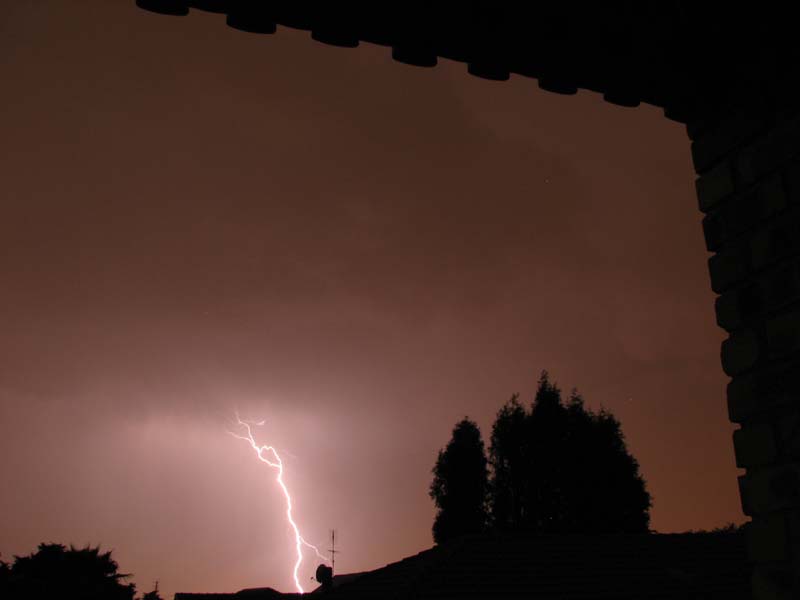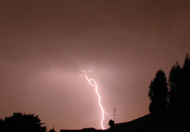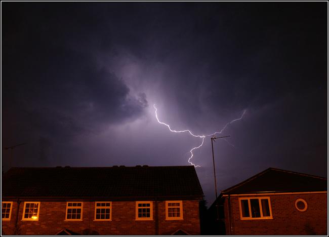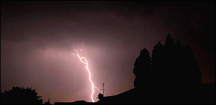 My feeling is that the picture could do with more in the sky to complement the drama of the lightning - some cloud detail, for example. A bit more of the silhouette of the trees and houses on the ground would also balance the image better.