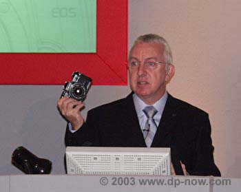 James Leipnik (chief of communications and corporate relations, Canon Europe) brandished a mysterious black camera at us, but it wasn't the new EOS-300D, but a 27 year old Canon AE-1 film camera. Canon believes the 300D is the most important consumer SLR camera since the Canon AE-1 back in 1976. At the time the AE-1 revolutionised the market by introducing lightweight plastic materials to replace heavy metal body casings and, above all else, introducing a completely electronic camera control system. These developments brought more features at a lower price to the consumer market, just like Canon is doing with the 300D.