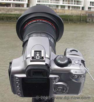 This is the view most 300D owner will probably have of their camera! The space that might have been taken by the LCD status display on the top plate of the camera has been claimed by an auto/manual exposure mode and scene selection dial. The lens attached to this particular body is the Canon L-series 16-35mm f/2.8 super wide angle. The RRP £899.99 EOS-300D is the first Canon DSLR to be substantially less expensive than this lens (typically £1,400).