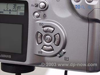Note the replacement of the trade-mark EOS thumb-wheel mode adjuster with a more conventional (and inferior in many ways) compass-point button arrangement. Canon says the 300D's target market is likely to be more at home with this design than the thumb-wheel.
